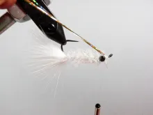 11. Maintain tension as you secure the tinsel and tie in on the bottom of the hook, keeping the tinsel in centerline with the hook.