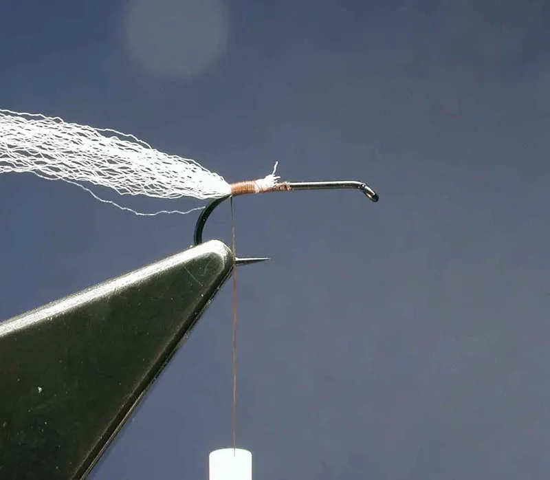 Start the thread at the midpoint of the hook shank. Tie in a length of poly yarn (diameter not exceeding the outside diameter of the hook eye) extending over the bend. Stop right above the barb.