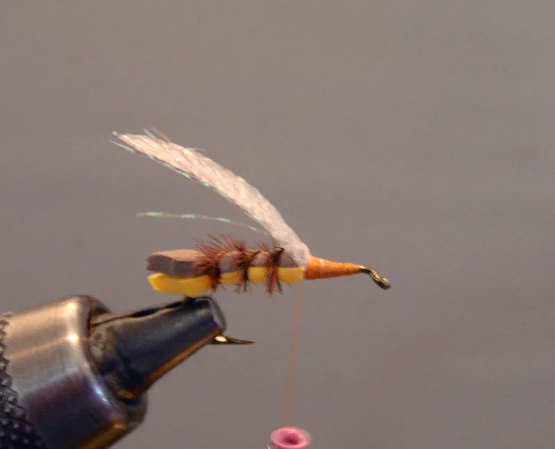 Tie it down so that it extends about one hook gaps length beyond the abdomen