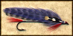• Wing: 6-8 strands of peacock herl, over which are two orange saddle hackles, flanked on each side by a dark blue saddle hackle.